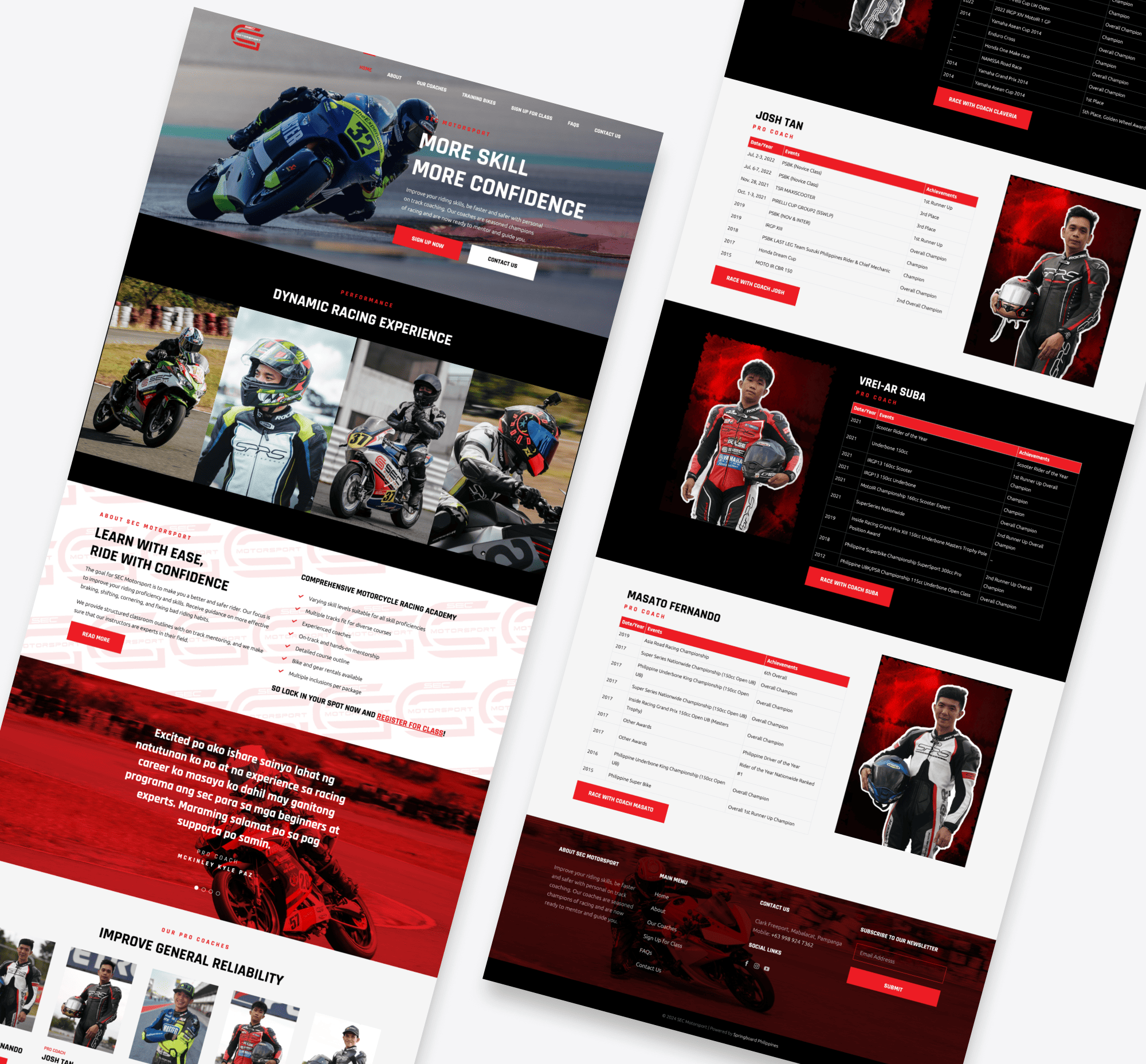 This is a motorcycle academy website where clients can sign up for track class, selecting their preferred type of motorcycle and coach for an enhanced learning experience.