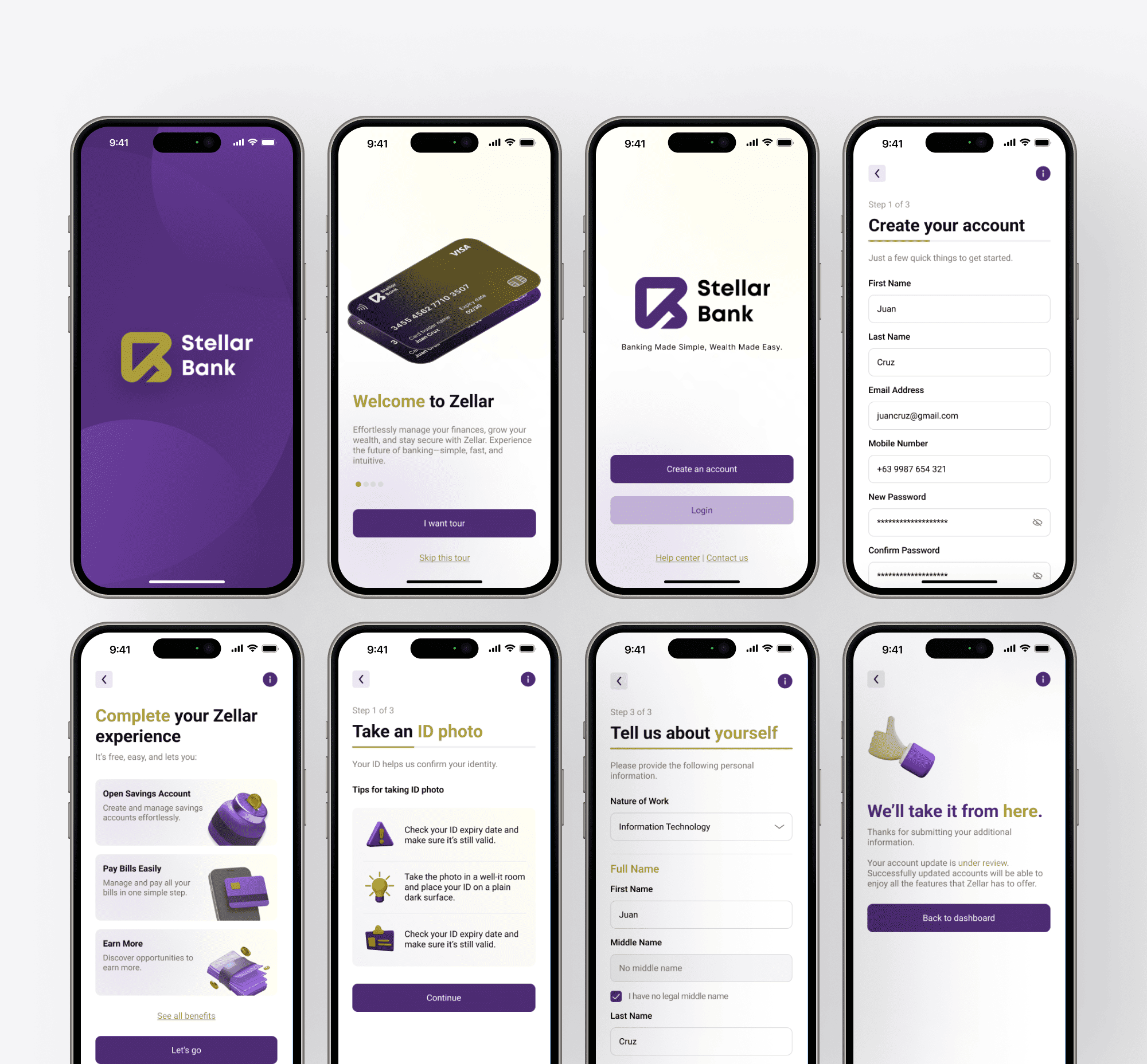 This is a UI design project for a local digital banking app. The design showcases the onboarding process and KYC verification steps.