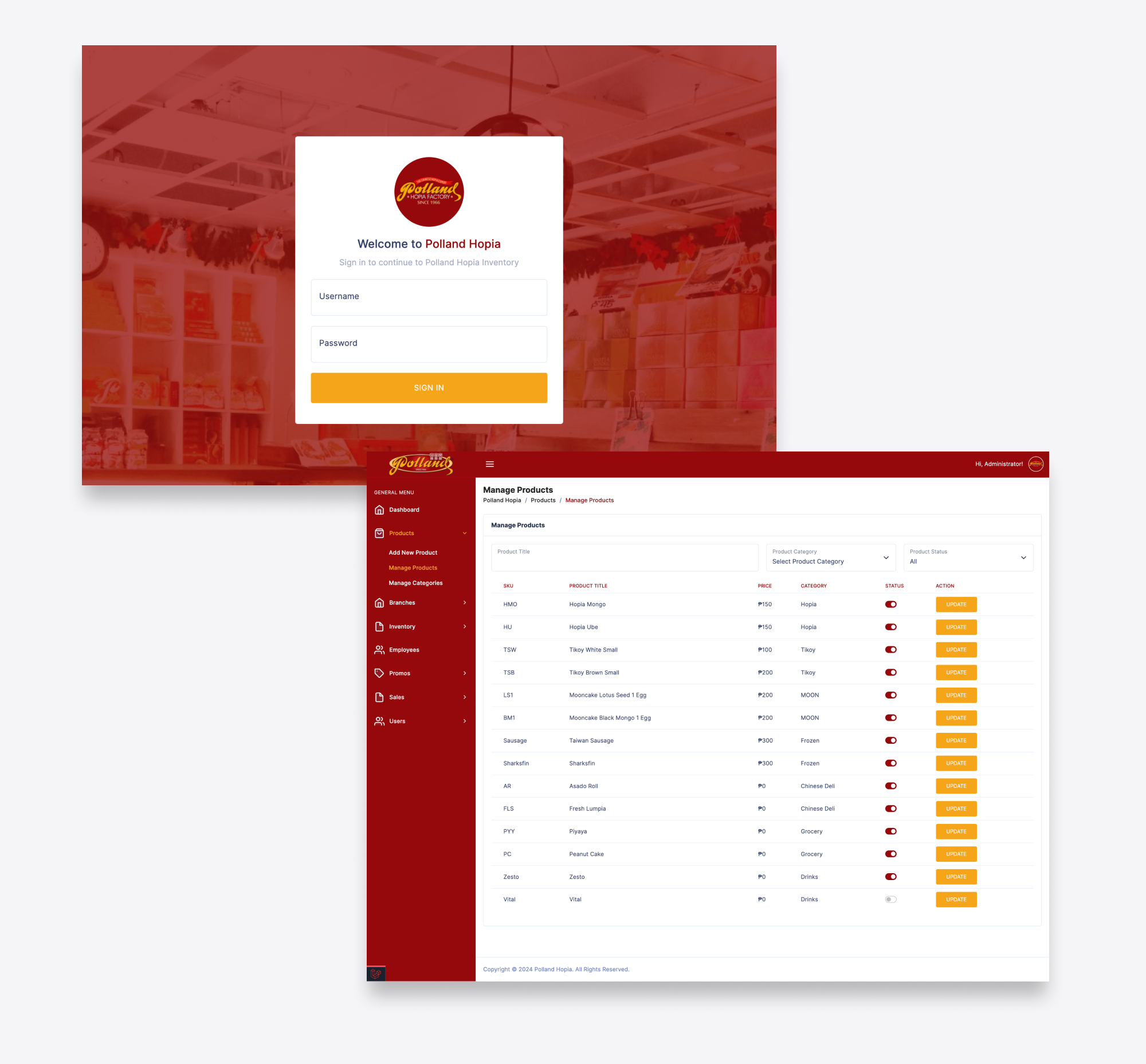 This is an inventory management system designed specifically for Polland Hopia, allowing you to efficiently monitor stock levels across all branches. With this system, you can track inventory in real-time, ensuring that each branch is stocked according to demand and preventing any shortages.