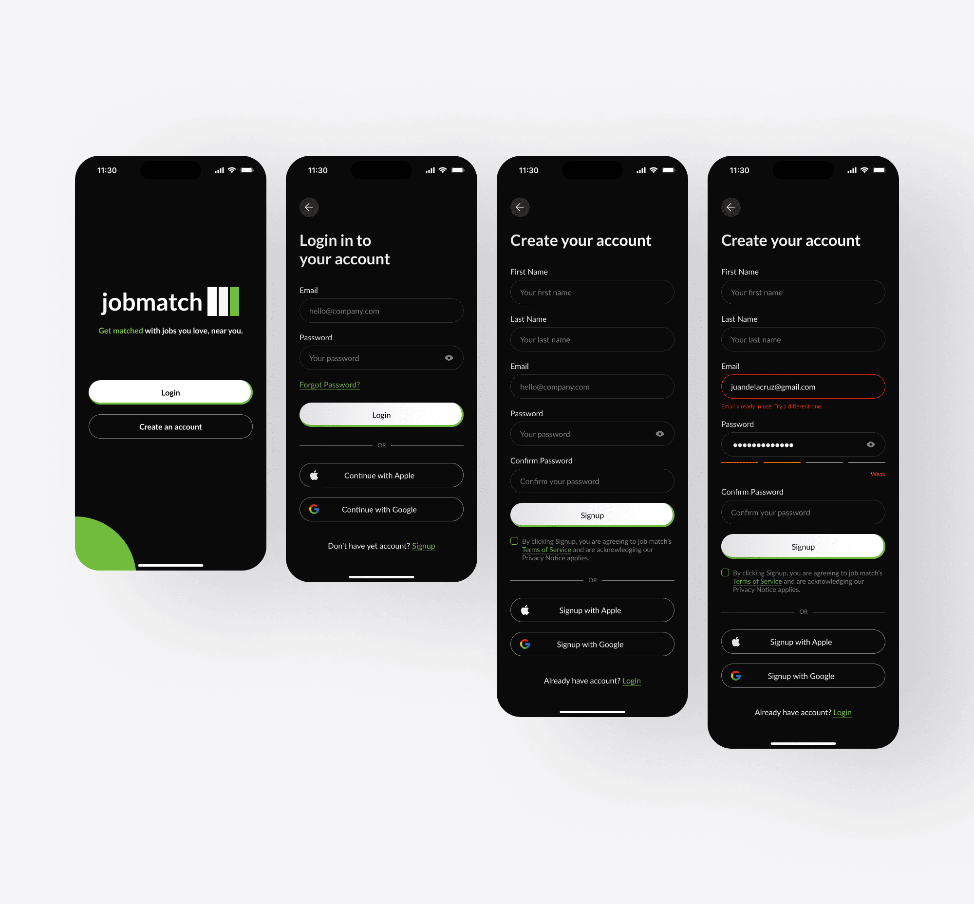 This is a straightforward UI design for the login and signup screens of a job portal app.