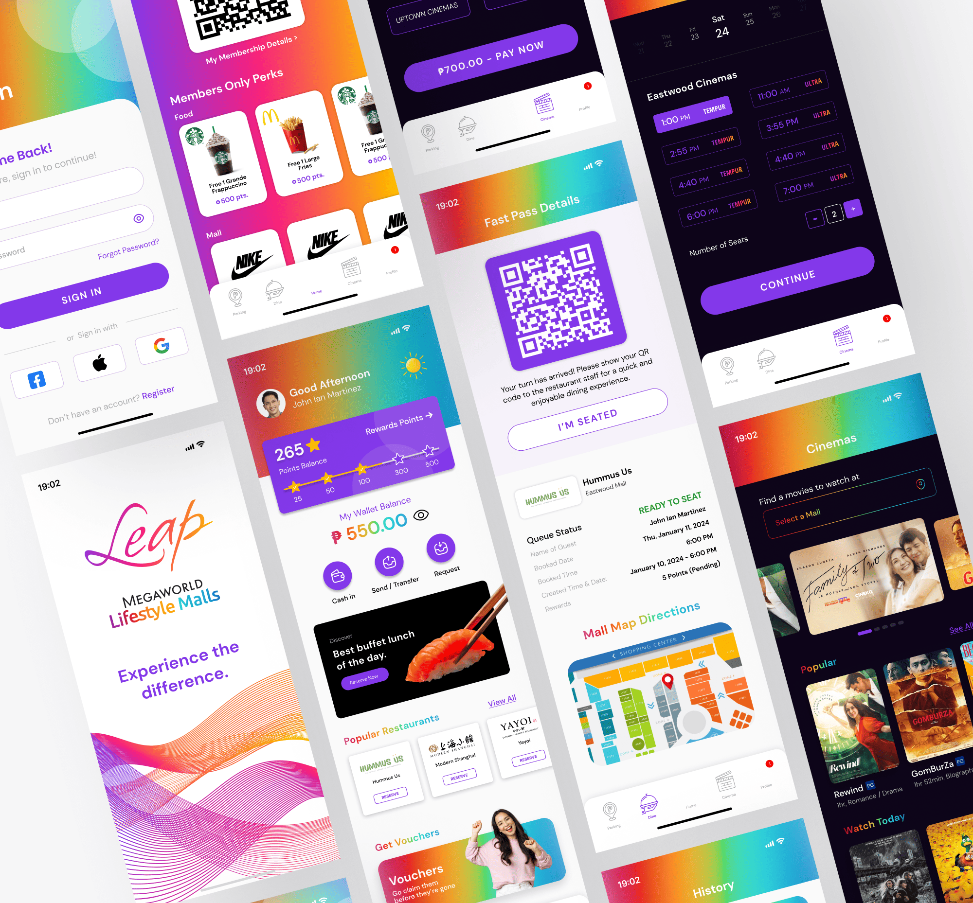 This UI design illustrates an app created exclusively for a company, offering a variety of features, including food ordering, parking reservations, and cinema ticket bookings.